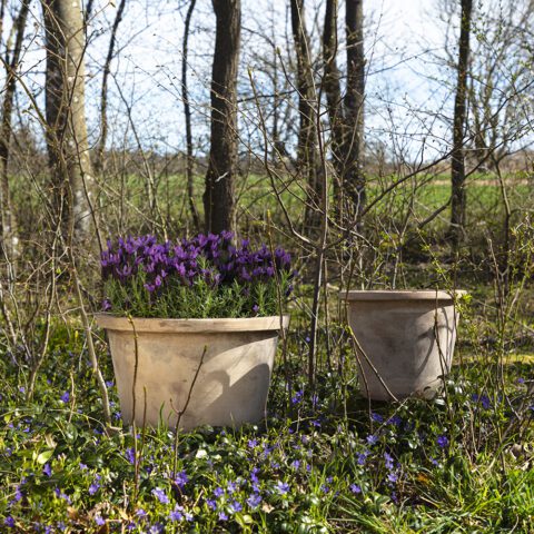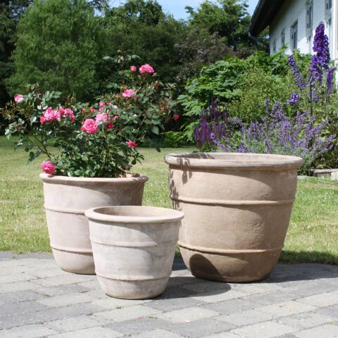 Handcrafted pots in antique terracotta, which have a beautiful, antique surface due to the patina finish.