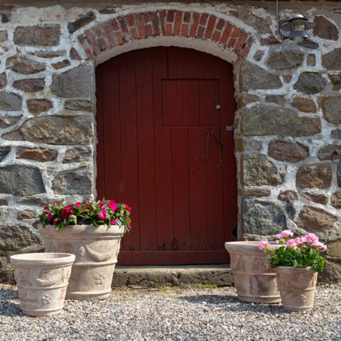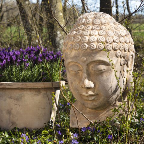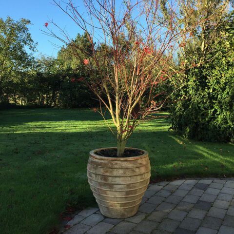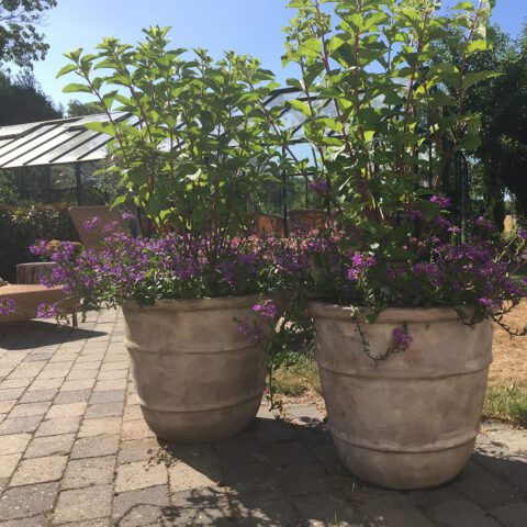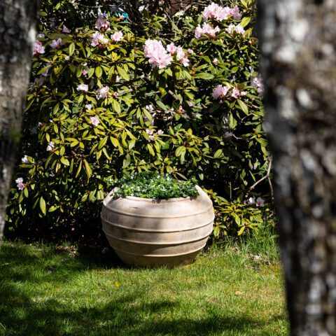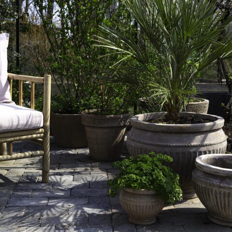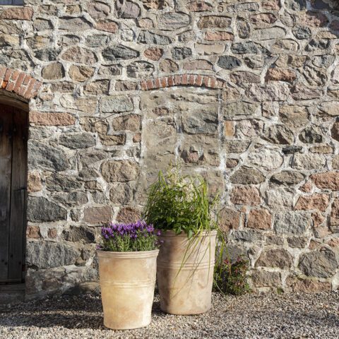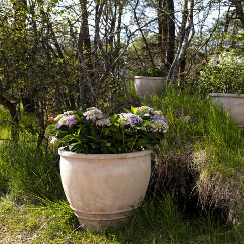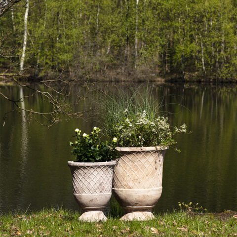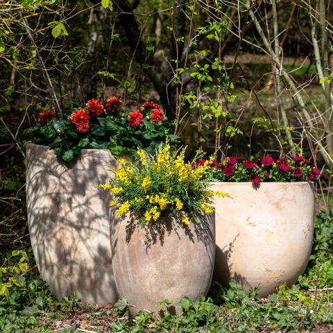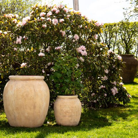 The patinated surface gives the pots an antique expression that blends perfectly with the romantic garden.